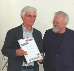 Dass es überhaupt einen gut dotierten THT-Preis gibt, verdanken wir unserem Mäzen Veit Feger (Ehingen). Er hob die Einzigartigkeit des THT-Projekts hervor; auch war es ihm ein Herzensanliegen, die „unvergleichliche“ Arbeit des Gründers und beständigen Organisators von THT zu würdigen. Daher überreichte er Dr. Wolfgang Proske eine wertvolle Goldmünze; auf hartnäckige Nachfrage erfuhr Feger, dass Proske 48 Beiträge zu THT recherchiert und verfasst hat, als Herausgeber allerdings mit Blick auf den Autor:innenpreis „außer Konkurrenz“ bleibt…